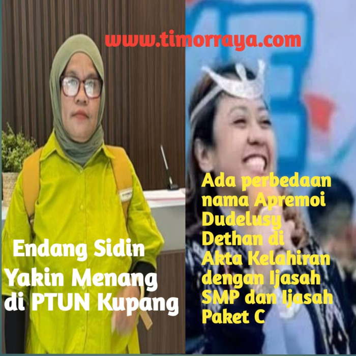 Kupang, NTT – Nama Apremoi Dudelusy Dethan yang tertera dalam Akte Kelahiran dan Ijasah SMP maupun Ijasah paket C ada Perbedaan,hal ini membuat Endang Sidin selaku Penggugat yakin menang bahwa Keputusan Pengadilan Tata Negara mengabulkan seluruh permohonannya.