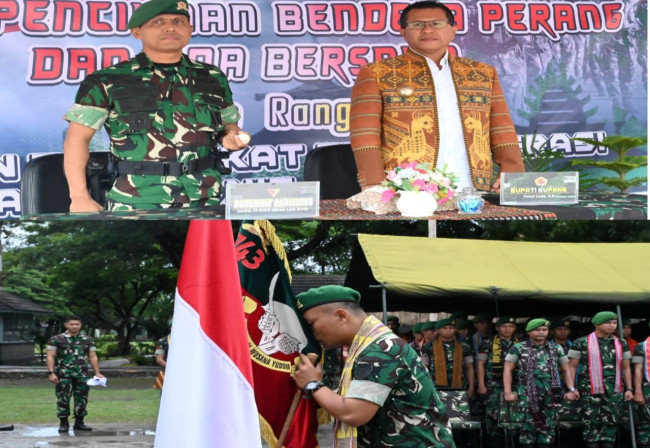 Oelamasi,- Bupati Kupang, Yosef Lede, dan Wakil Bupati Kupang, Aurum Titu Eki, Kamis (1/5), menghadiri acara Tradisi Penciuman Bendera Perang Batalyion Infantri 743/PSY dan Doa Bersama dalam rangka kesiapan pemberangkatan tugas 450 anggota Yonif 743/PSY ke Puncak Jaya, Papua.
